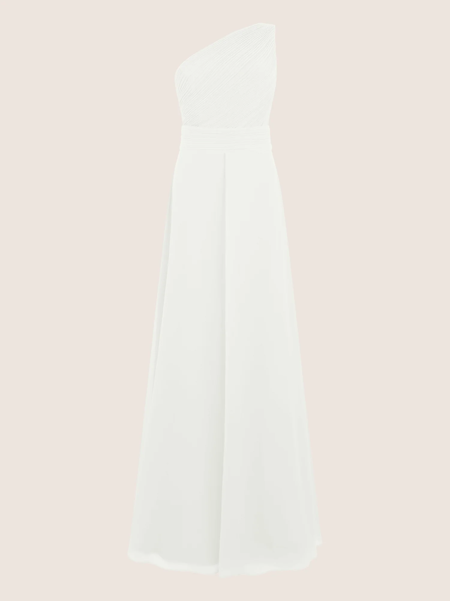 Dieses elegante Abendkleid überzeugt mit einem raffinierten One-Shoulder-Design, das durch feine, diagonal verlaufende Plisseefalten im Brustbereich hervorgehoben wird. Der breite, taillierende Bund akzentuiert die Figur auf stilvolle Weise und sorgt für eine feminine Silhouette. Der fließende Chiffonrock in Maxilänge fällt weich und bewegt sich anmutig bei jedem Schritt. Ob Gala, Hochzeit oder besondere Einladung – dieses Kleid versprüht pure Eleganz und ist ein garantierter Hingucker auf jedem Event.