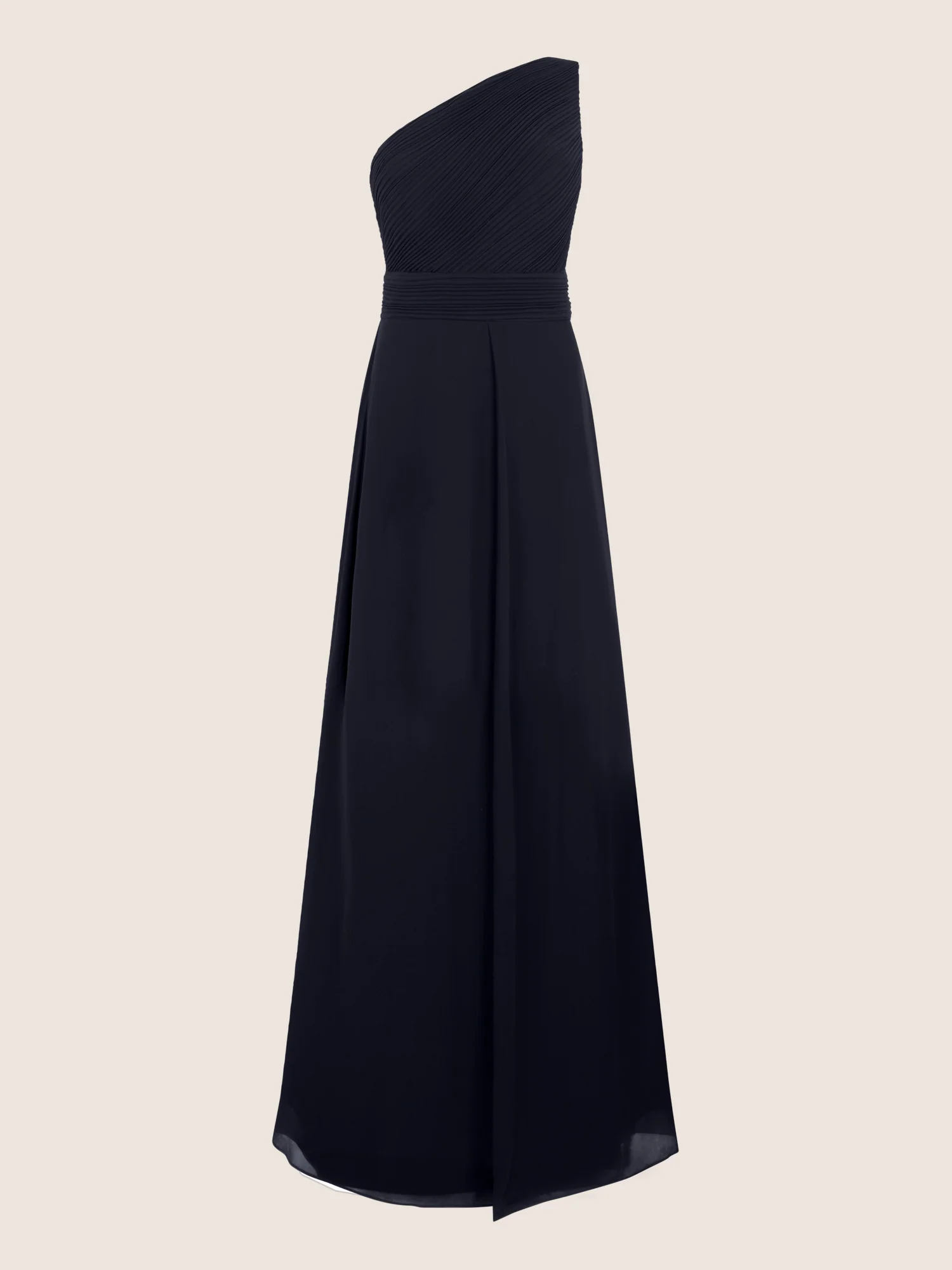 Dieses elegante Abendkleid überzeugt mit einem raffinierten One-Shoulder-Design, das durch feine, diagonal verlaufende Plisseefalten im Brustbereich hervorgehoben wird. Der breite, taillierende Bund akzentuiert die Figur auf stilvolle Weise und sorgt für eine feminine Silhouette. Der fließende Chiffonrock in Maxilänge fällt weich und bewegt sich anmutig bei jedem Schritt. Ob Gala, Hochzeit oder besondere Einladung – dieses Kleid versprüht pure Eleganz und ist ein garantierter Hingucker auf jedem Event.