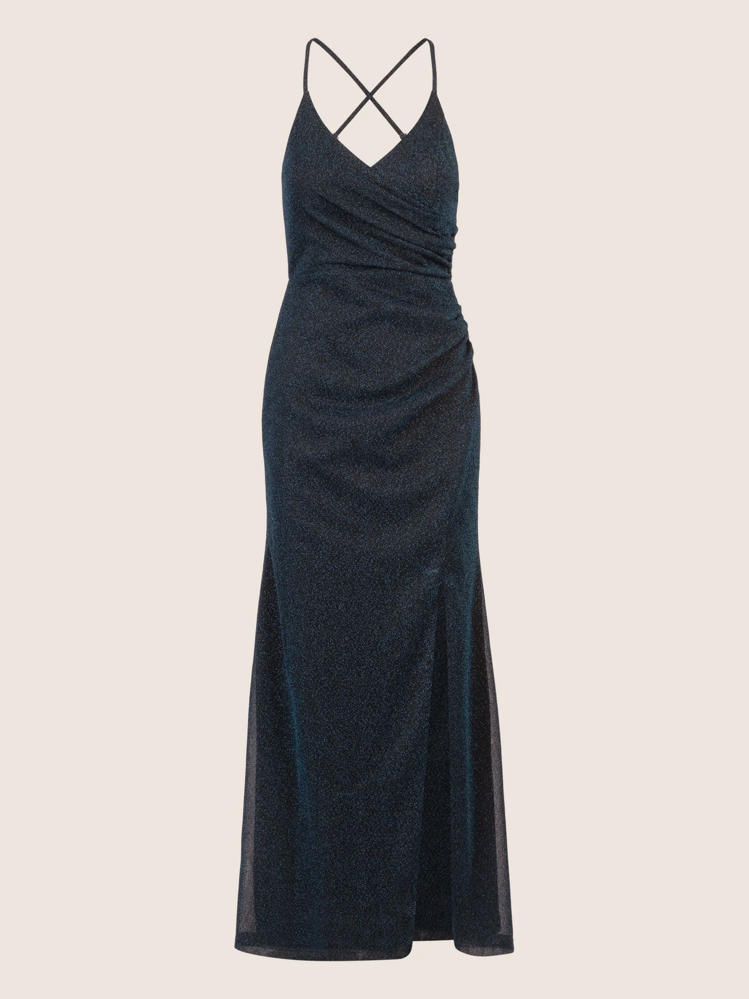 Schimmerndes Abendkleid aus hochelastischem Glitzerjersey mit femininer Wickeloptik und tiefem V-Ausschnitt. Die schmalen, verstellbaren Träger sind hinten raffiniert überkreuzt. Raffungen an der linken Hüfte betonen die Silhouette, während der Fishtail-Rock mit hohem Beinschlitz für einen dramatischen Auftritt sorgt. Reißverschluss hinten. Komplett gefüttert. Länge: ca. 150 cm.