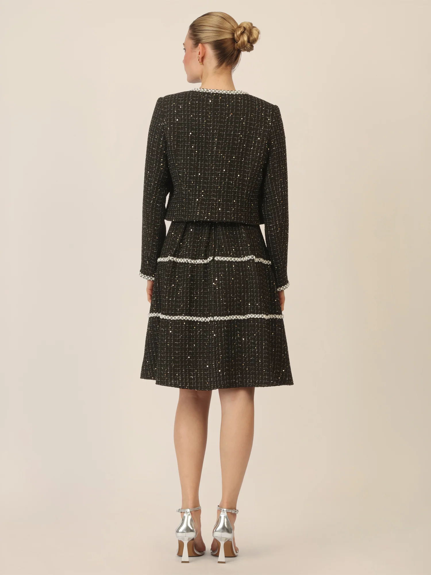 - Kante und Ärmelsaum mit einer Perlenborte verziert