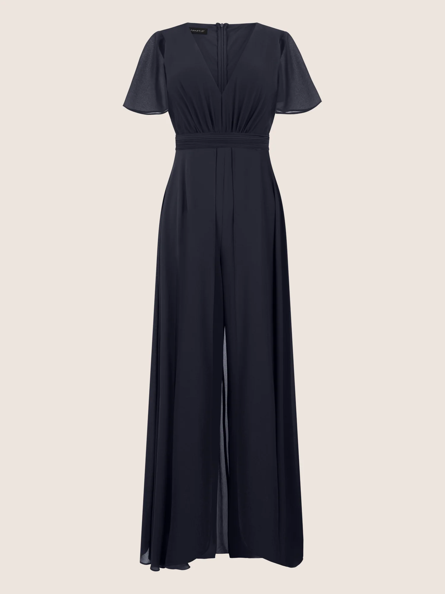 Dieser elegante Jumpsuit vereint stilvolle Raffinesse mit maximalem Tragekomfort. Der tief ausgeschnittene V-Ausschnitt sorgt für ein feminines Dekolleté, während der breite Bund mit feinen Zierfalten die Taille vorteilhaft betont. Die kurzen, leicht transparenten Ärmel verleihen dem Look eine luftige Leichtigkeit. Besonders auffällig ist die weite, fließende Beinpartie mit asymmetrischem Verlauf im Vorderteil, die dem Jumpsuit eine anmutige Silhouette verleiht. Ein verdeckter Reißverschluss im Rücken garantiert einen perfekten Sitz. Ideal für festliche Anlässe oder stilvolle Sommerabende.