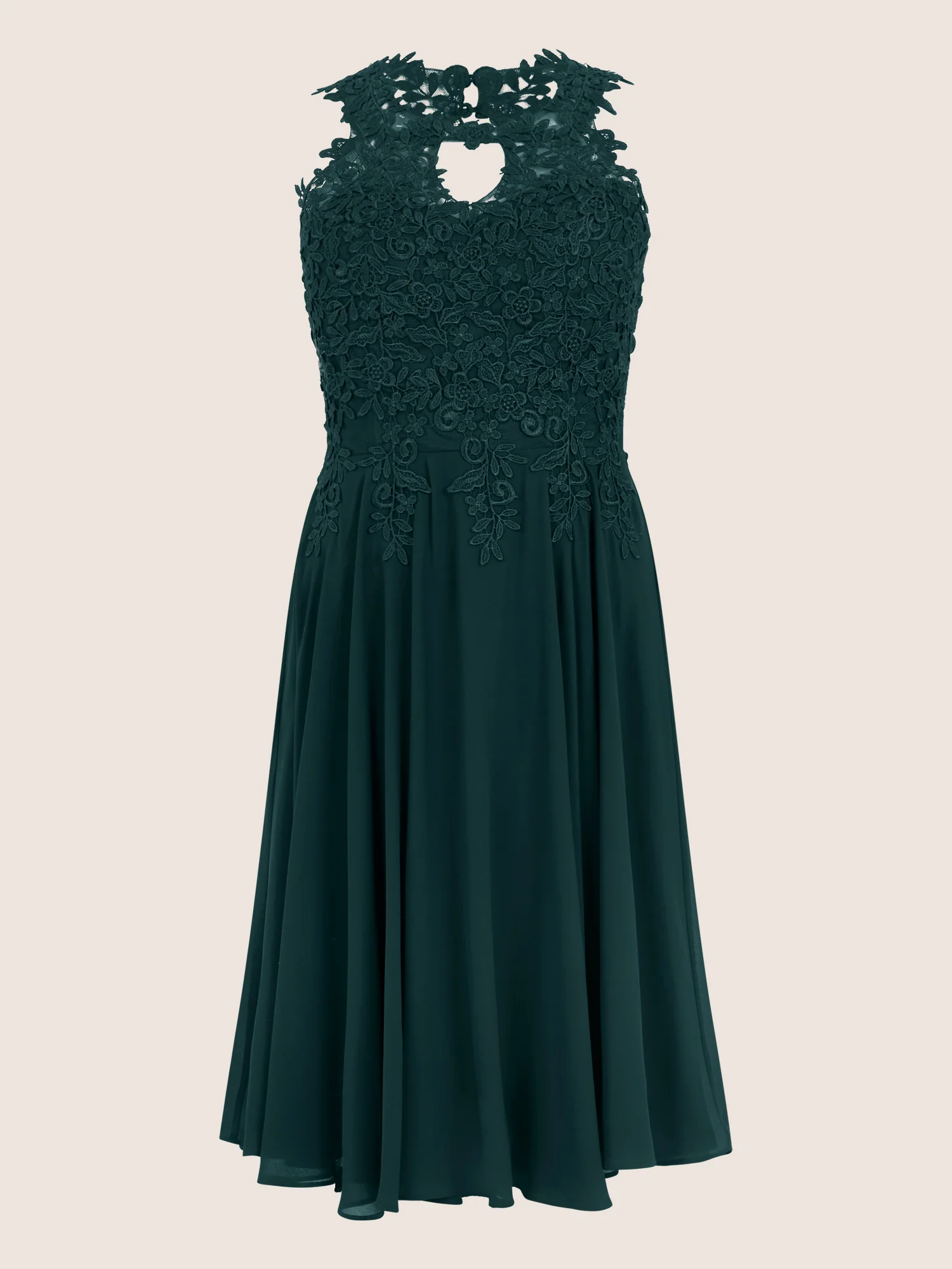 Dieses Kleid vereint raffinierte Spitze mit fließendem Chiffon zu einem traumhaften Gesamtbild. Das ärmellose Oberteil begeistert mit kunstvoller, floraler Spitze und zarten Cut-outs am Dekolleté, die einen femininen Akzent setzen. Der ausgestellte Rock aus fließendem Chiffon unterstreicht die Leichtigkeit des Looks und verleiht ihm eine verspielte Eleganz. Ein kleiner Schlüssellochverschluss am Rücken rundet das Design stilvoll ab. Ein perfektes Kleid für Hochzeiten, Sommerfeste oder besondere Events.