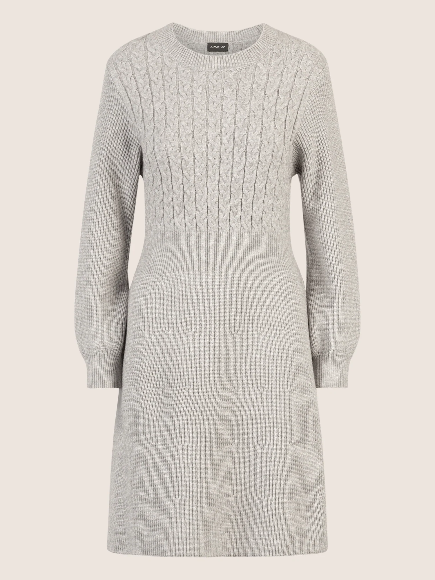 Dieses Grobstrickkleid verbindet maximalen Kuschelfaktor mit stilvollem Design. Die soften, elastischen Viskose-Kaschmir-Mischung fühlt sich traumhaft auf der Haut an, während das aufwendig gearbeitete Zopfmuster am Oberteil vorne und hinten echte Eyecatcher setzt. Der runde Ausschnitt mit Rippenblende und die weiten Halbpatent-Ärmel mit feinem Bündchen unterstreichen den entspannten Look. Ein breiter Rippeneinsatz betont elegant die Taille, bevor der leicht glockige Rock in ausgestellter Form sanft schwingt. Mit ca. 94 cm Länge perfekt für stilvolle Herbstmomente.